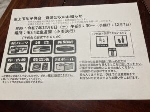 2025年11月8日 / 最終更新日 : 2025年11月8日 b05035e 子供会 資源回収 東上玉川子供会は下記のとおり資源回収を行います。ご協力よろしくお願いいたします。 日時 令和7年12月6日(土) 午前9時30分〜 場所 玉川児童遊園
